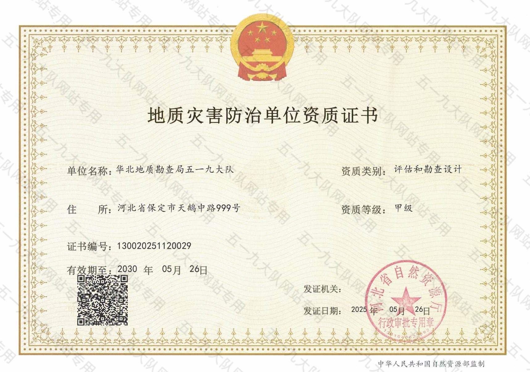 地质灾害防治单位资质证书(评估和勘查设计甲级)