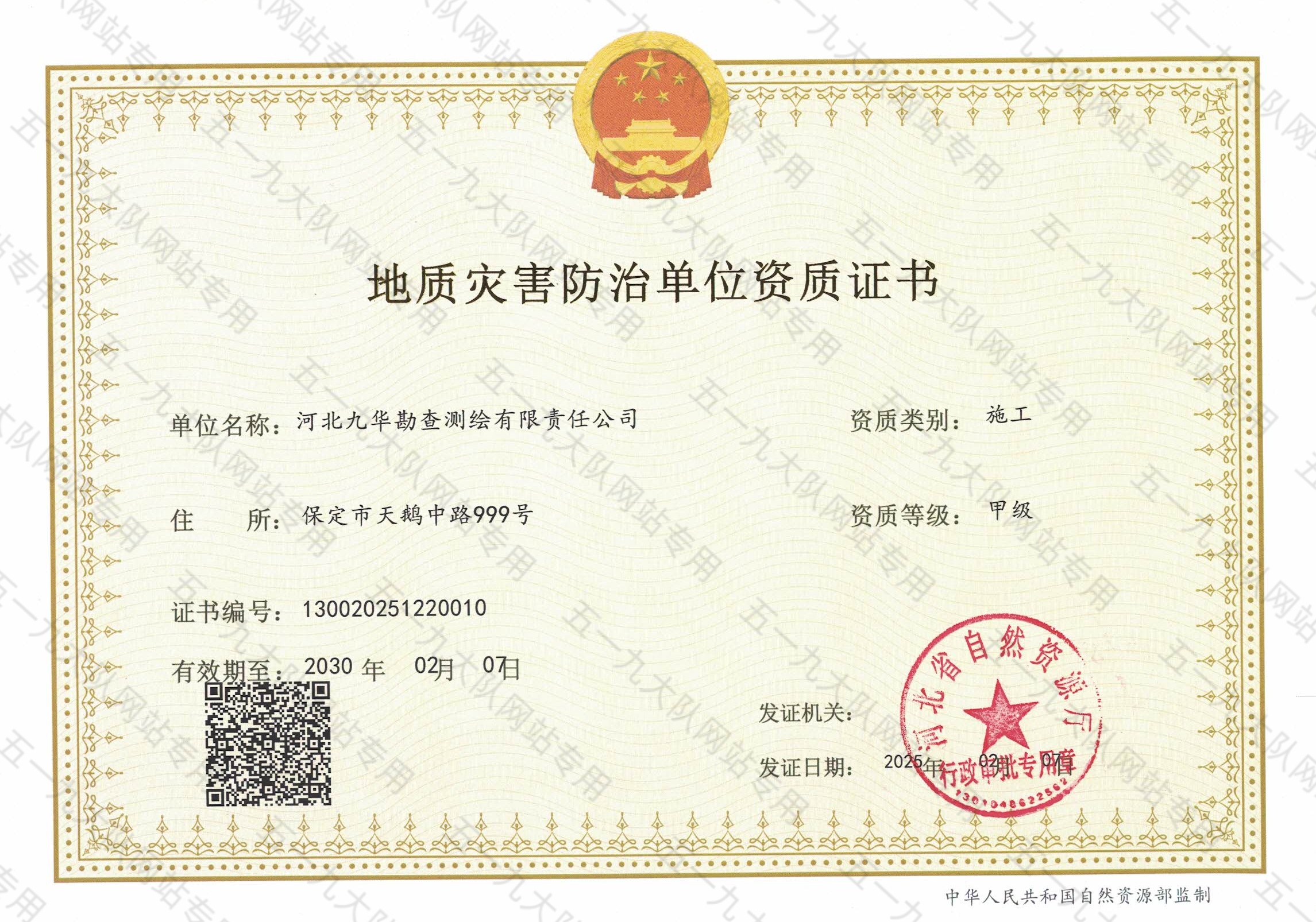地质灾害防治单位资质证书(施工甲级)